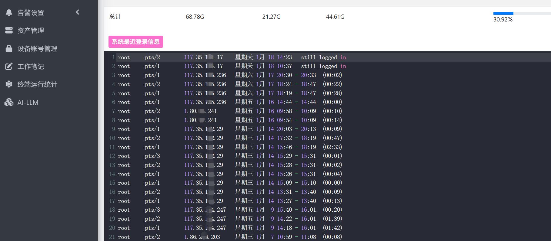 主机备注、主机总计接收流量、主机总计发送流量、主机agent版本、agent上报时间(秒)、所属成员账号、标签、系统用户最近登录信息