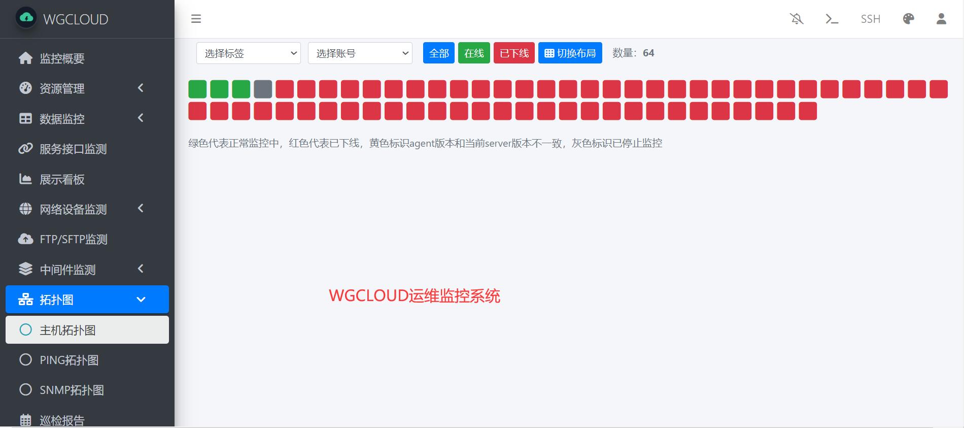 WGCLOUD会自动生成所有监控主机的网络拓扑图,和PINGP网络设备监控的拓扑图,以及SNMP网络设备监控的拓扑图