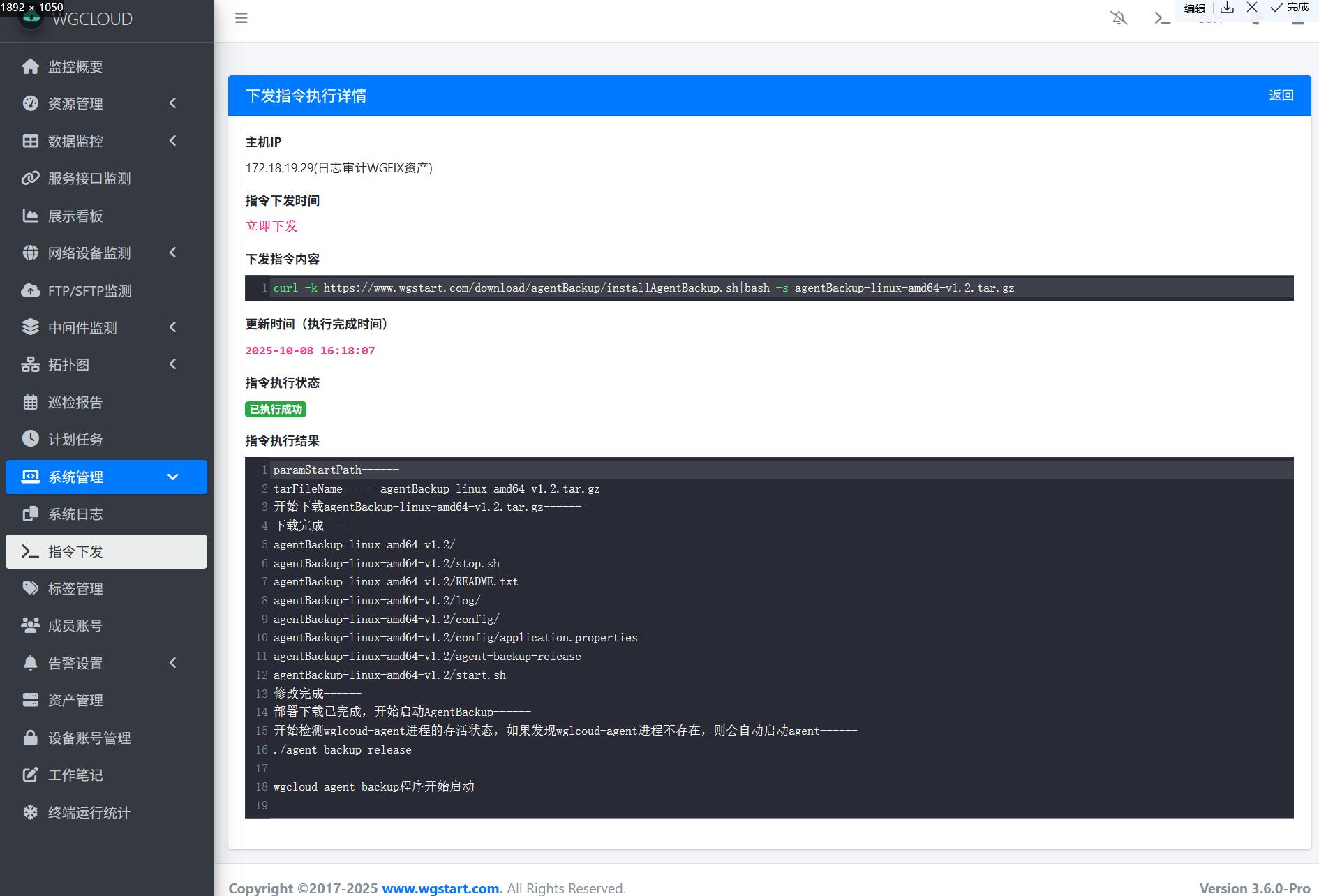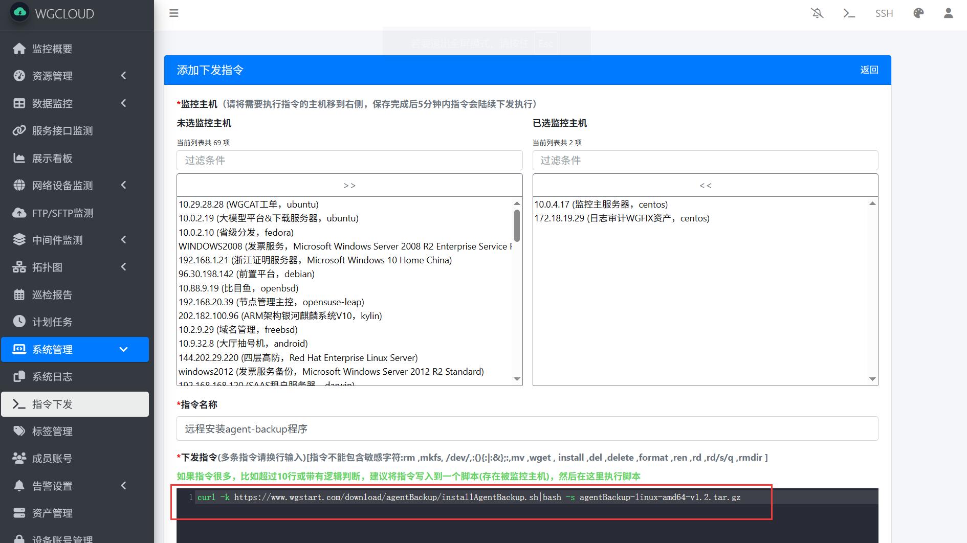 2、在【指令下发】模块,选中需要安装程序agent-backup的被控主机下发指令,指令如下