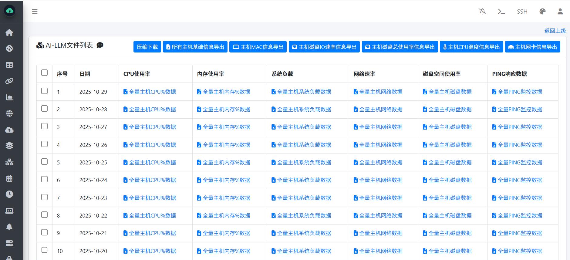 这里有所有监控主机的各种监控数据Excel文件,我们可以下载这些文件,投喂给自己的大模型平台,然后进行推理分析