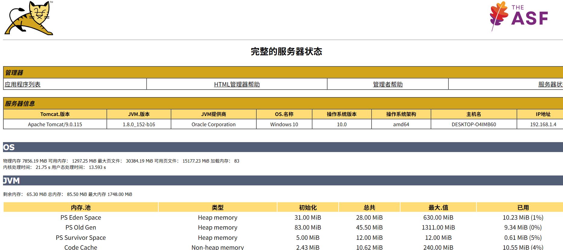 然后我们在浏览器访问下Tomcat的这个URL:http://localhost:8080/manager/status/all,输入我们刚添加的账号密码,看看是否可以访问页面