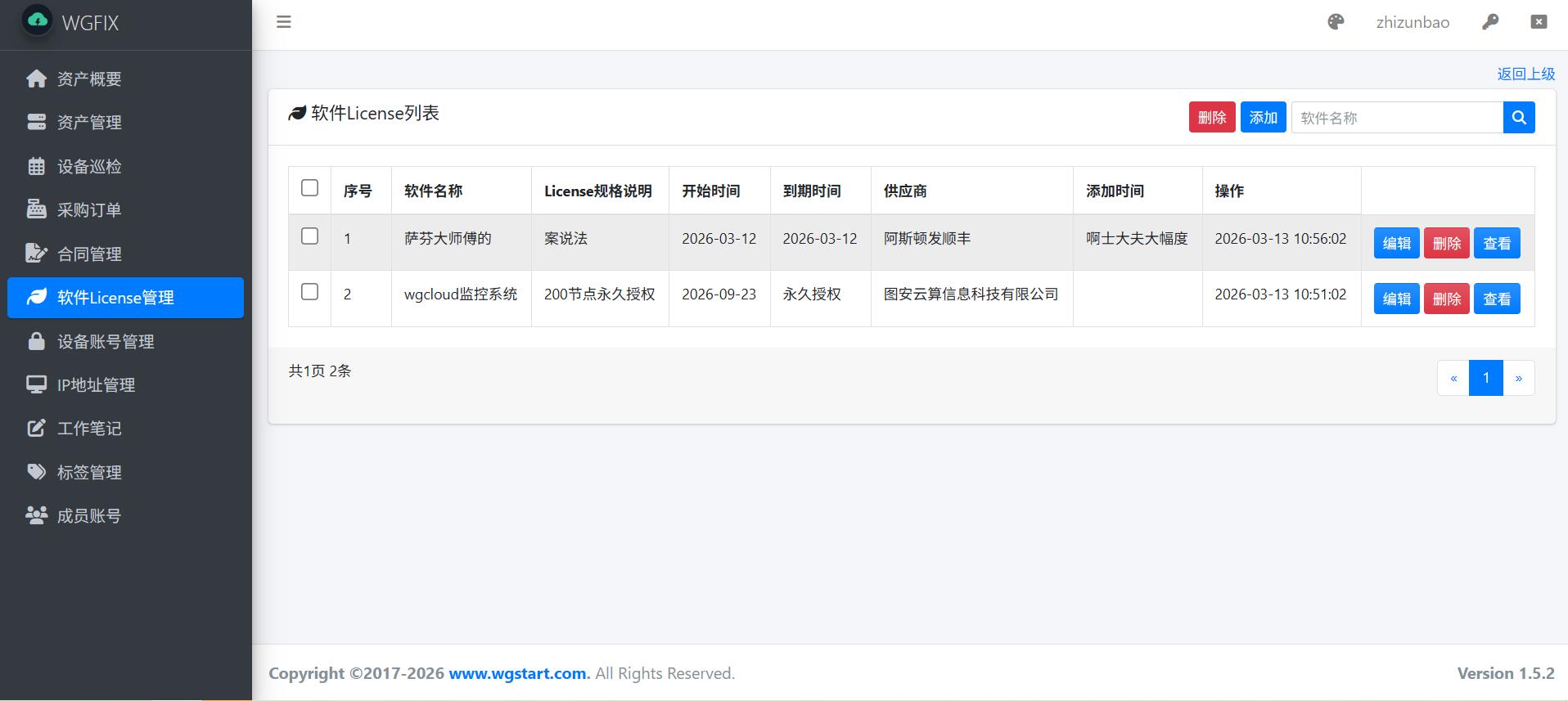 WGFIX的软件License管理模块,是一个用于管理我们的软件License信息的模块,支持上传多个附件